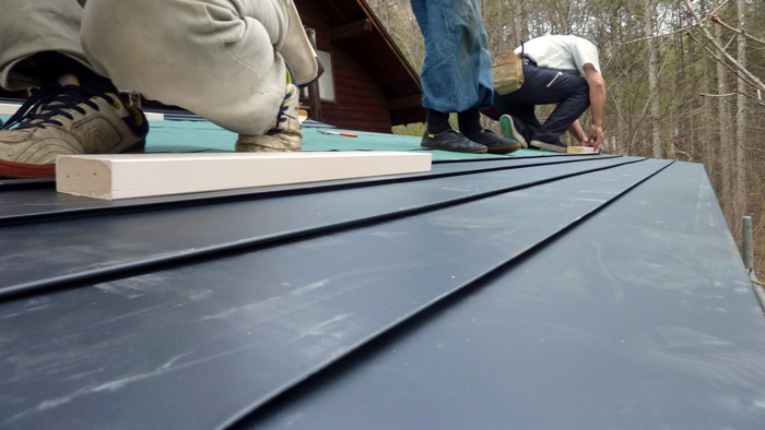 午後、タイミングよく屋根の材料屋さんが屋根材(横葺き板金材)を持って来てくれました。