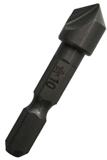 まず、下穴はネジの軸径と同じくらいか、やや太い直径(φ4mm)であけておきます。そこに、このハイス六角軸面取カッターで皿穴をあけます。